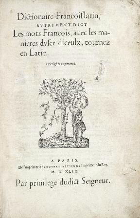 ment dict Les motz François, avec les manieres d'user d'iceulx, tournez en Latin. Corrigé & augmenté. Paris, Robert Estienne, 1549. In-folio, vélin crème, dos à nerfs ( Reliure de l’époque ).