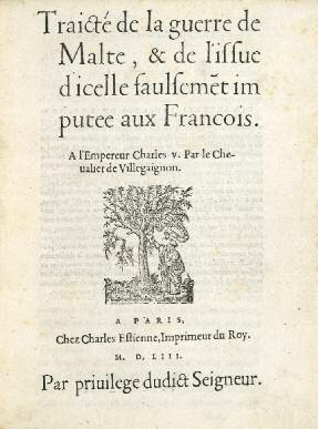 – VILLEGAGNON (Nicolas Durand, chevalier de). Traicté de la guerre de Malte, & de l'issue d'icelle faul-sement imputee aux François. Paris, Charles Estienne, 1553. Guigard, 37. – Renouard, p. 106. Première édi-tion de la traduction française.