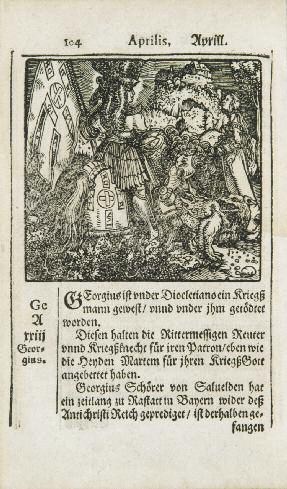 Calendrier ecclésiastique en langue allemande, orné de 89 bois d'après les dessins d'artistes célèbres. Dans le catalogue raisonné de sa bibliothèque (I, 51), Firmin Didot nous signale que l'ouvrage fut composé avec les bois qu'Egenolff avait acquis du fonds d'impri-merie de Hans Steyn d'Augsbourg. La première édition fut publiée en 1561.