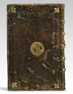 Edition en caractères gothiques, le titre en rouge et noir, orné de la marque de Jehan Petit. Elle est illus-trée de 5 bois, tirés des Heures de Kerver de 1522. I NTÉRESSANTE RELIURE DU XVIE SIECLE , ORNÉE DES PORTRAITS DES PHILOSOPHES D IDON ET P LATON AU CENTRE DES PLATS .