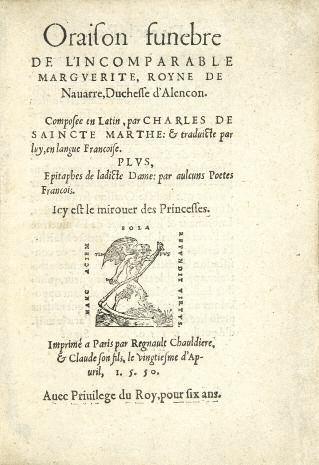 Première édition de la traduction française, d'après la version latine publiée la même année sous le titre In obitum incomparabilis Margaritae [...] Oratio funebris [...]. Le titre est orné de la marque typographique des Chaudière père et fils, qui se sont associés pour l'impression de l'ouvrage.