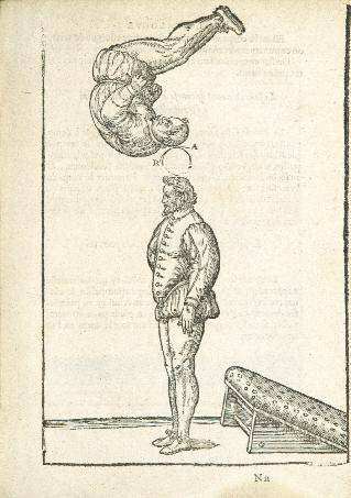Ce traité de gymnastique est de la plume du fameux acrobate Archange Tuccaro, né vers 1535 dans les Abruzzes, et dont l'empereur Maximilien II s'était attaché les services. On y trouve tout un développement consacré aux arts de la danse, dont l'auteur prônait la valeur péda-gogique. 87 bois dans le texte, dont plusieurs à pleine page, montrant des acrobates exécutant des sauts et des exercices de voltige. Manque la planche dépliante et le dernier feuillet (blanc). Un cahier volant ainsi que le feuillet de privilège, destinés à complèter l’exemplaire. Travaux de vers en marge infé-rieure affectant parfois le texte, mouillure brune aux angles, quelques rousseurs. Le dos a été refait au début du XIX e siècle dans un atelier bri-tannique, comme l'atteste le matériel employé (fers à la couronne anglaise).