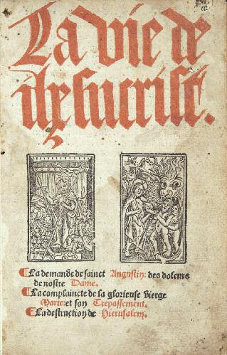 Impression en caractères gothiques, titre xylo-graphique en rouge et noir, orné de 2 bois. Grand bois gravé à pleine page représentant une Crucifixion au verso du dernier feuillet, et nom-breux petits bois dans le texte.