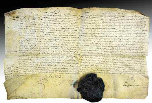 vélin in-plano, grand sceau cire noire pendant sur soies rouges et vertes (brisé).