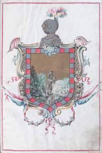 filet rouge, planche armoriée en frontispice, grande vignette aquarellée