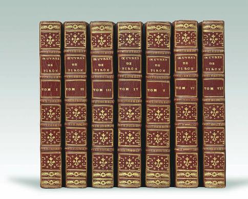 7 volumes in-8, maroquin rouge, triple flet, dos orné, roulette intérieure, tranches dorées (