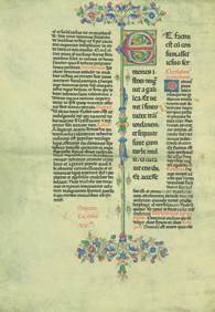 Texte sur deux colonnes avec grande initiale ornée de gouache et fond d’or bruni avec une