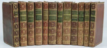 11 vol. in-16; maroquin rouge. Triple filet doré en encadrement sur les plats. Dos lisse orné. Pièces de titre et