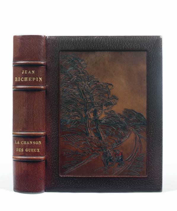 importante composition de cuir incisé et teinté de Steinlen représentant un paysage avec deux personnages, dos à nerfs,