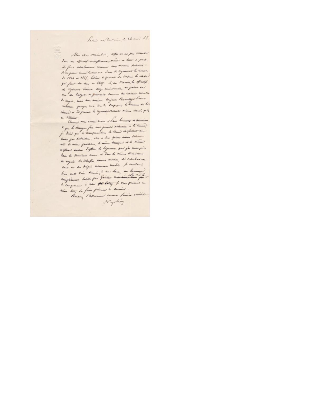 1867. 1 pp. bi-feuillet in-8 à son chiffre couronné.