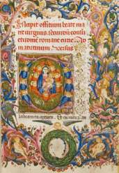 phytomorphic motifs in blue, red, green, and gold with putti and angels. The first of these initials depicts the Virgin with the