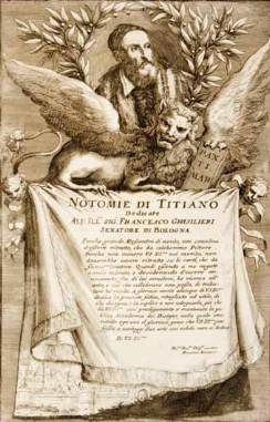 Il frontespizio contiene il ritratto di Tiziano tra le foglie di alloro, il leone di San Marco, un drappo