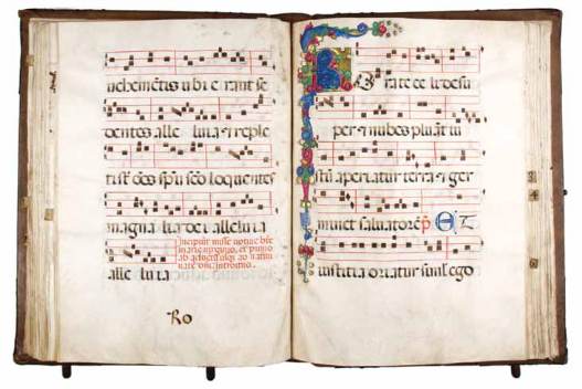 prima parte centinaia di capilettera in rosso e blu e 19 grandi iniziali figurate finemente decorate a motivi floreali