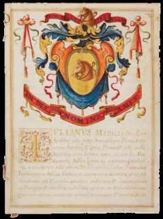 Manoscritto pergamenaceo. Dimensioni del foglio (mm 223x166). Fogli [4]. Ampia miniatura con stemma