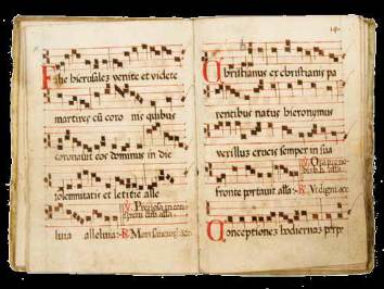 Note quadrate scritte su tetragrammi tracciati a inchiostro rosso, così come i capilettera. Alla carta 1