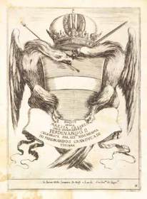 grande stemma imperiale, i due ritratti di Ferdinando II, le tre tavole ripiegate con la facciata della Chiesa di San Lorenzo, l’interno