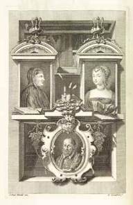 Ritratto dell’Autore insieme a madonna Laura entro cornice di festoni e putti alati in apertura dei