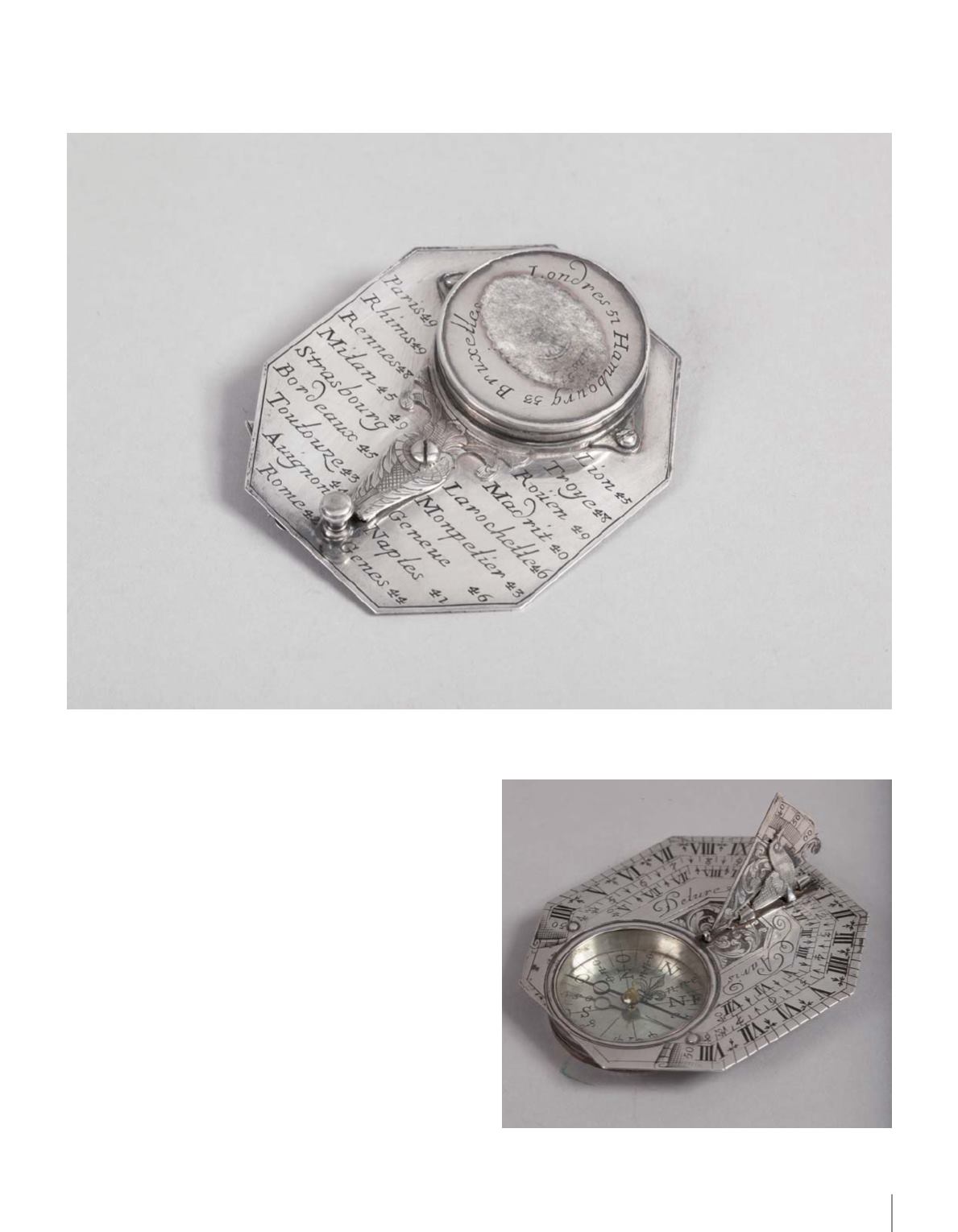 et 50°. Gnomon à l’oiseau, gravé de volutes, rabattable. Les latitudes