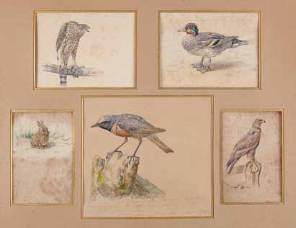 5 dessins d’études et cartes de voeux montés en un ensemble :