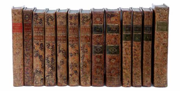 coupes, tranches rouges (reliure de l’époque). Mors fendillés, coiffes et