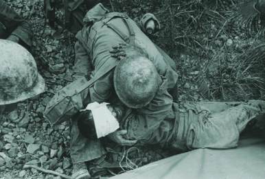 “A soldier of the 184th Regiment is lifted onto Stretcher”,