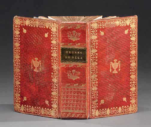 grains longs havane. Dos lisse entièrement recouvert d’un décor doré, large encadrement doré sur les plats avec de grandes fleurs dorées en écoiçons, encadrant des armes ecclésiastiques dorées.