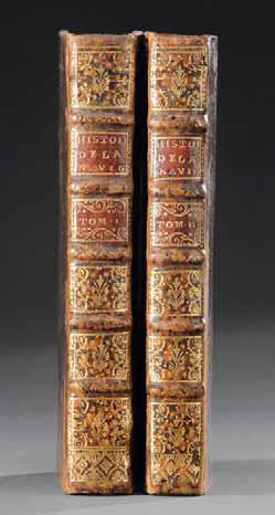 commencement, son progrès & ses découvertes jusqu’à présent. Tr adu i t de l ’Ang l o i s . LE COMMERCE DES INDES OCCIDENTALES. Avec un catalogue des meilleures cartes géographiques & des meilleurs livres de voyages, & le caractère de leurs auteurs. PARIS, GANEAU, 1722. Deux volumes, in-12, de (6) f., 378 pp., (3) f. - (4) f., 316 pp., pleines reliures de l’époque en veau moucheté, dos à nerfs ornés et dorés portant les pièces de titre et de tomaison en maroquin rouge, coupes décorées et dorées, tranches rouges mouchetées de brun. Petites attaques de vers sur le premier plat du tome I, épidermure sur le premier plat du tome II.