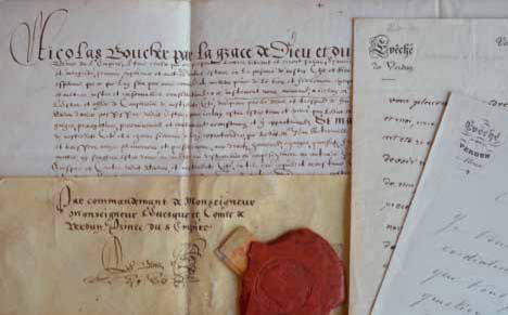 - Nicolas Boucher (1588-1593). P.S. sur parchemin, avec grand sceau en cire rouge (7 cm de diamètre, manque ¼). Verdun,