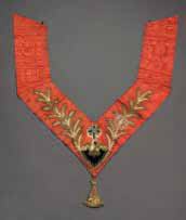 En soie rouge, largeur 10,5 cm. Avec une riche broderie épaisse : Pélican au pied du calvaire, la croix rayonnante chargée d’une rose