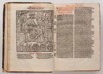 Imprimé en caractères gothiques, en rouge et noir, à deux colonnes.