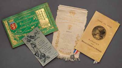 L’on remarque : le menu tissé mécaniquement sur soie pour le banquet à l’occasion de l’exposition, le 29 avril 1894 - Le menu sur