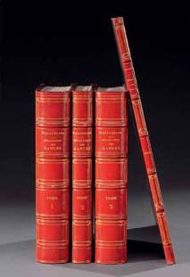 et un volume, in-4, atlas de 9 cartes, demi-reliures à coins en peau maroquinée rouge. Dos à nerfs ornés de caissons dorés