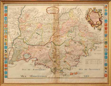 Carte avec cartouche et armoiries en couleurs, frontières en couleurs, dans un encadrement moderne de 53 × 63 cm. 200 / 400