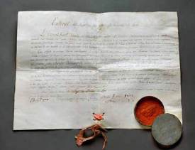 Manuscrit sur vélin, 42 x 31 cm, plié, avec son ruban de soie. Bel état.