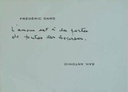 - P.A.S. sur sa carte de visite « Frédéric Dard » et dans l’autre sens « San Antonio », une pensée : «