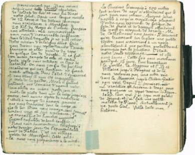 dans les marges ou en bas de page, avec des soulignures au crayon rouge ou bleu : nombreuses corrections du texte