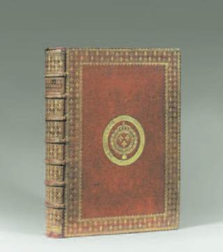 doubles monogrammes grecs ornant les plats, armoiries au centre, dos à nerfs orné du même motif,