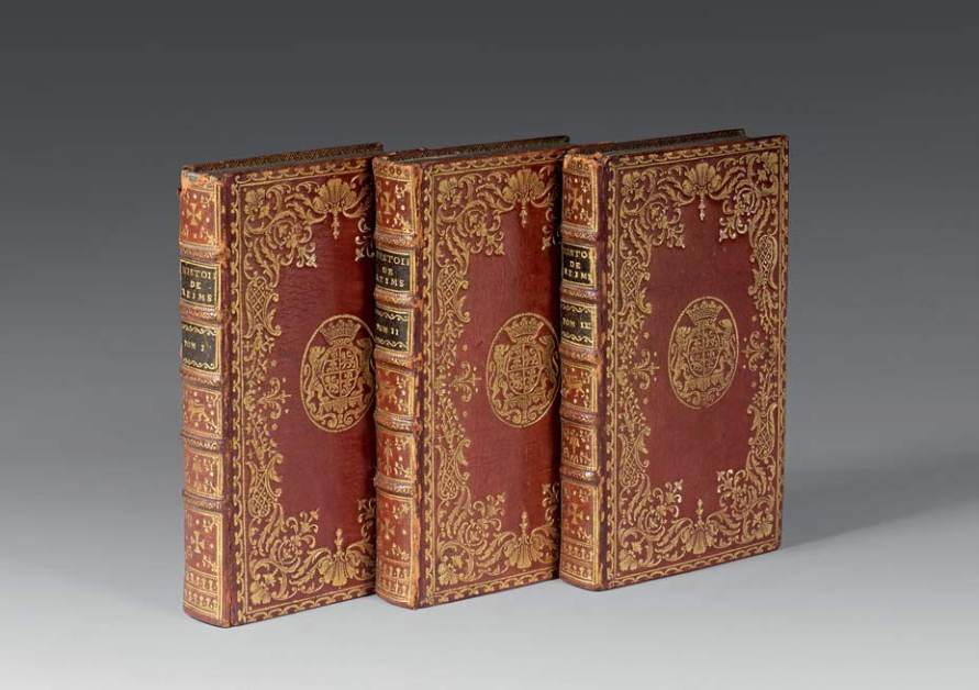 ornant les plats, fleuron aux angles, armoiries dorées au centre, dos à nerfs