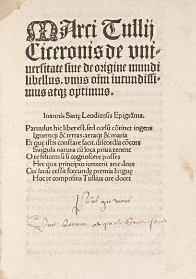 Marci Tullii // Ciceronis de uni=//uersitate siue de origine mundi // libellus. Unus omnium
