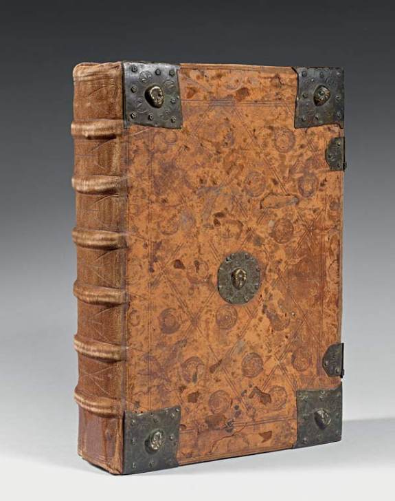 basane sur ais, à décor estampé à froid, cabochons à figures et fermoirs, dos à nerfs (