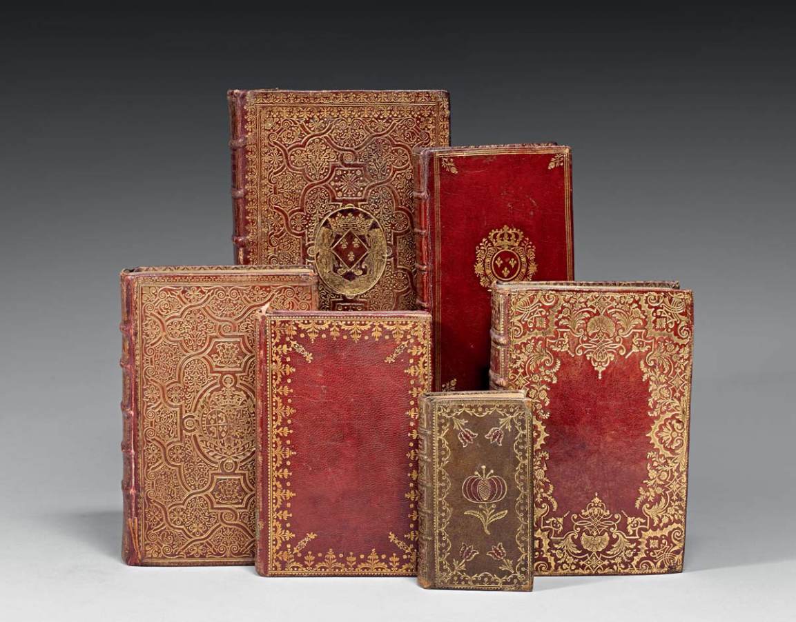 entièrement ornés d’un décor d’encadrement doré et mosaïqué de maroquin noir, armoiries au