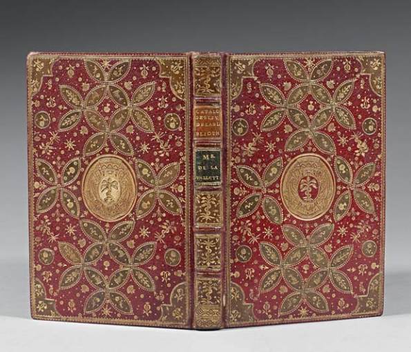 format petit in-8° (13 x 19,5 cm), maroquin rouge, plats entièrement ornés d’un décor doré, à rosaces