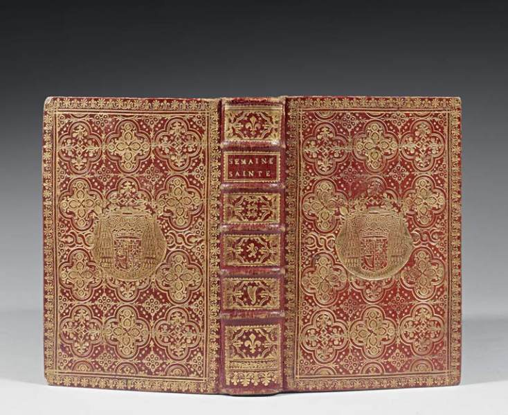 maroquin rouge, plats entièrement ornés d’un décor doré aux petits fers à motifs quadrilobés, armoiries