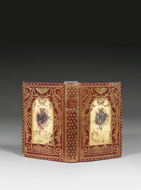 [1770]. In-8°, maroquin rouge, large dentelle dorée encadrant les plats, pièces d’armes aux angles,