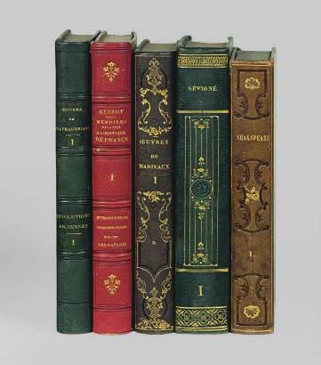 40 volumes in-8, demi-veau rose, dos à larges nerfs orné de compartiments de filets et dentelle dorés, pièces noires,