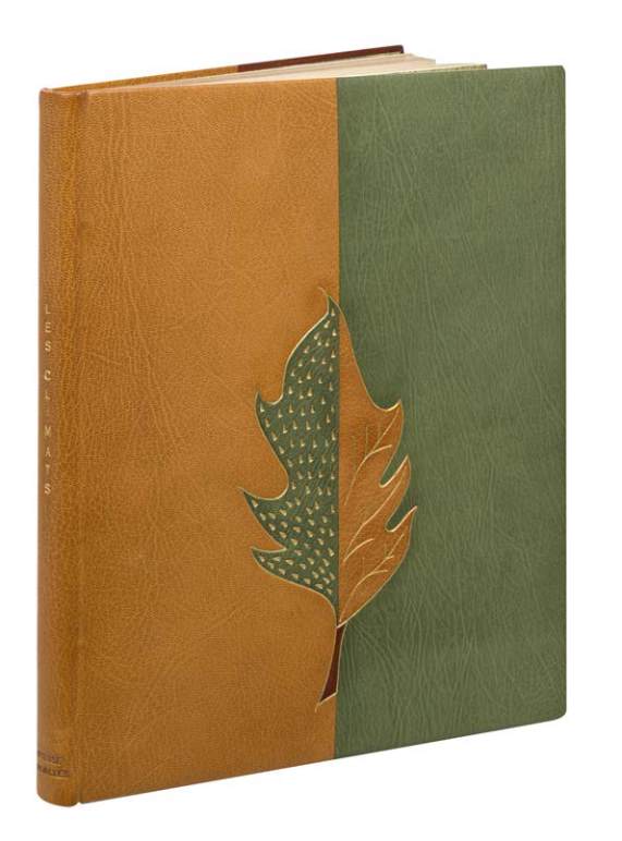 maroquin feuille morte sombre, à chaque plat feuille mosaiquée de l’un en l’autre, tracée et nervurée d’un filet doré et