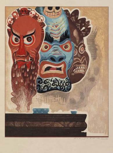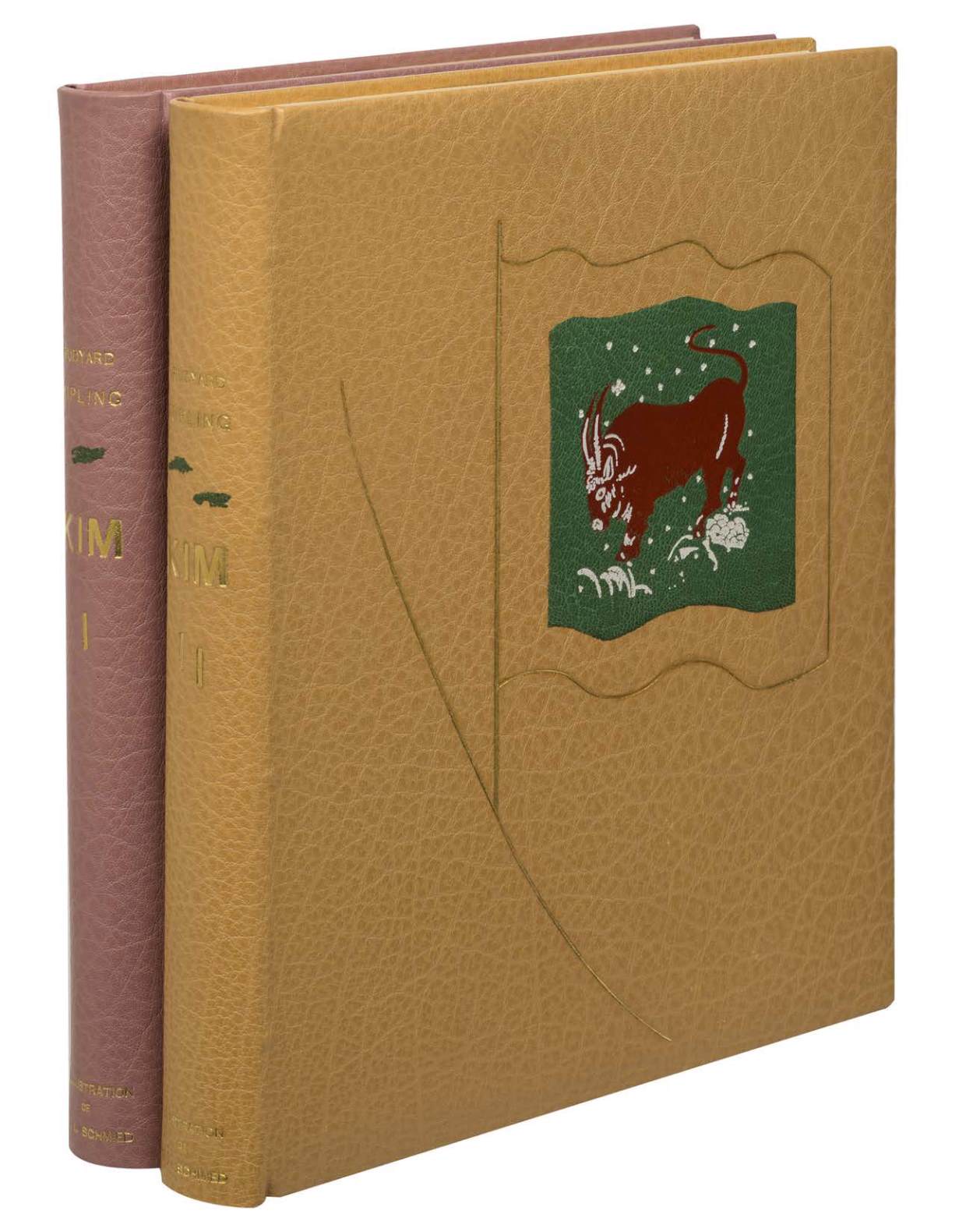portant un taureau rouge sang seché, dos lisse titré à l’or, chasses rembordées, contreplat et garde de papier à la cuve, triple