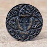 Écu à la croix, sommé d’un heaume d’où isse une tête de cerf. Légende en orle.