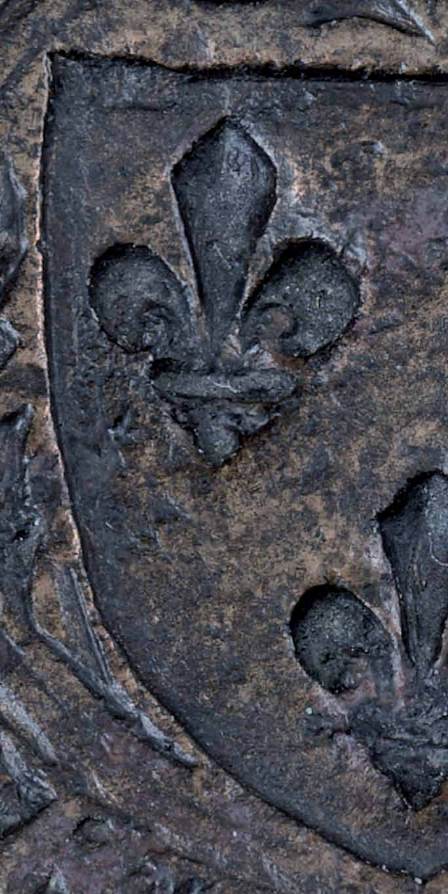 Écu (croisillons, au chef chargé de quatre fleurs de lys) dans un double