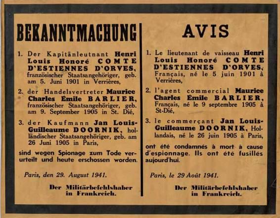 Affiche annonçant la condamnation à mort pour espionnage et le fusillement du lieutenant de vaisseau Henri Louis Honoré